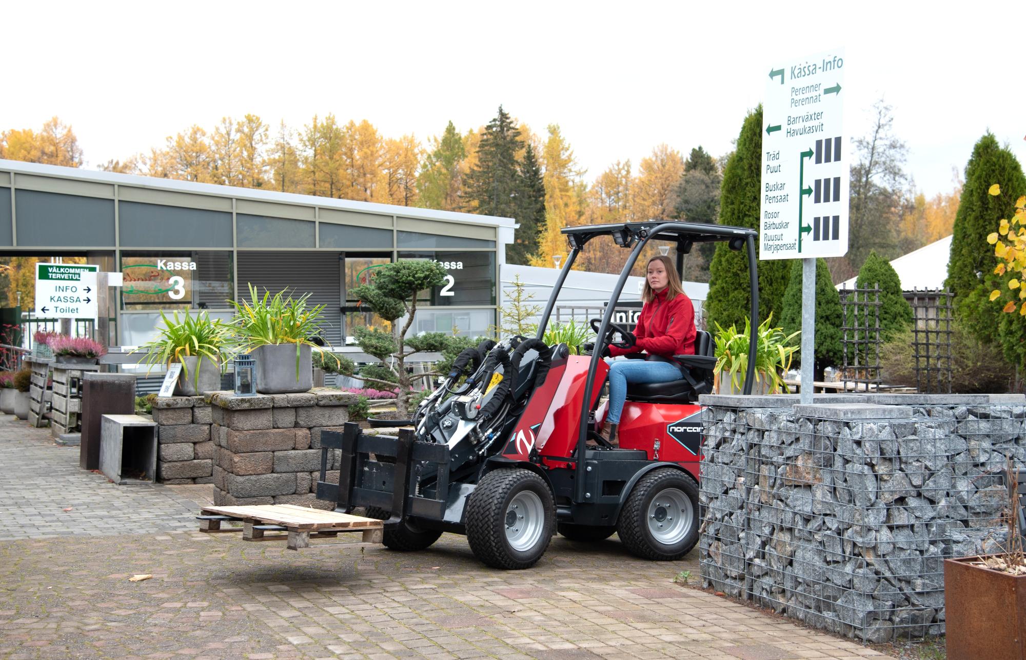 Norcar a60E1 on täydellinen työskentelyyn ääniherkissä ympäristöissä, joissa vallitsevat korkeat puhtausvaatimukset sekä sisä- että ulkotiloissa. Tästä syystä se soveltuu hyvin työskentelyyn talleissa, maatiloilla, rakennustyömailla ja puistoissa sekä kiinteistöhuoltoon.